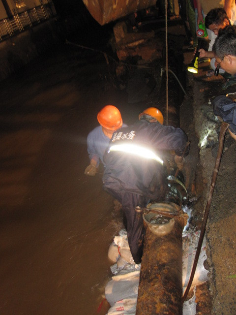 16點30分,紹興縣水務(wù)集團接到稽東鎮(zhèn)政府搶險救災(zāi)求助電話后,立即啟動了大口徑管道應(yīng)急搶修預(yù)案,隨即成立了由集團馮副總、供水公司總經(jīng)理李葉茂帶隊,18名供水安裝搶險人員組成的突擊搶修隊,第一時間冒雨趕赴現(xiàn)場。