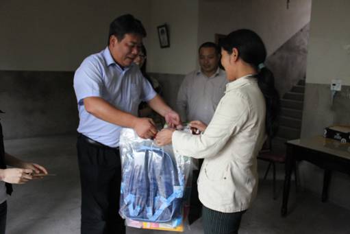 圖為公司領導董衛江副總為貧困兒童家庭送上慰問金和學習用品。